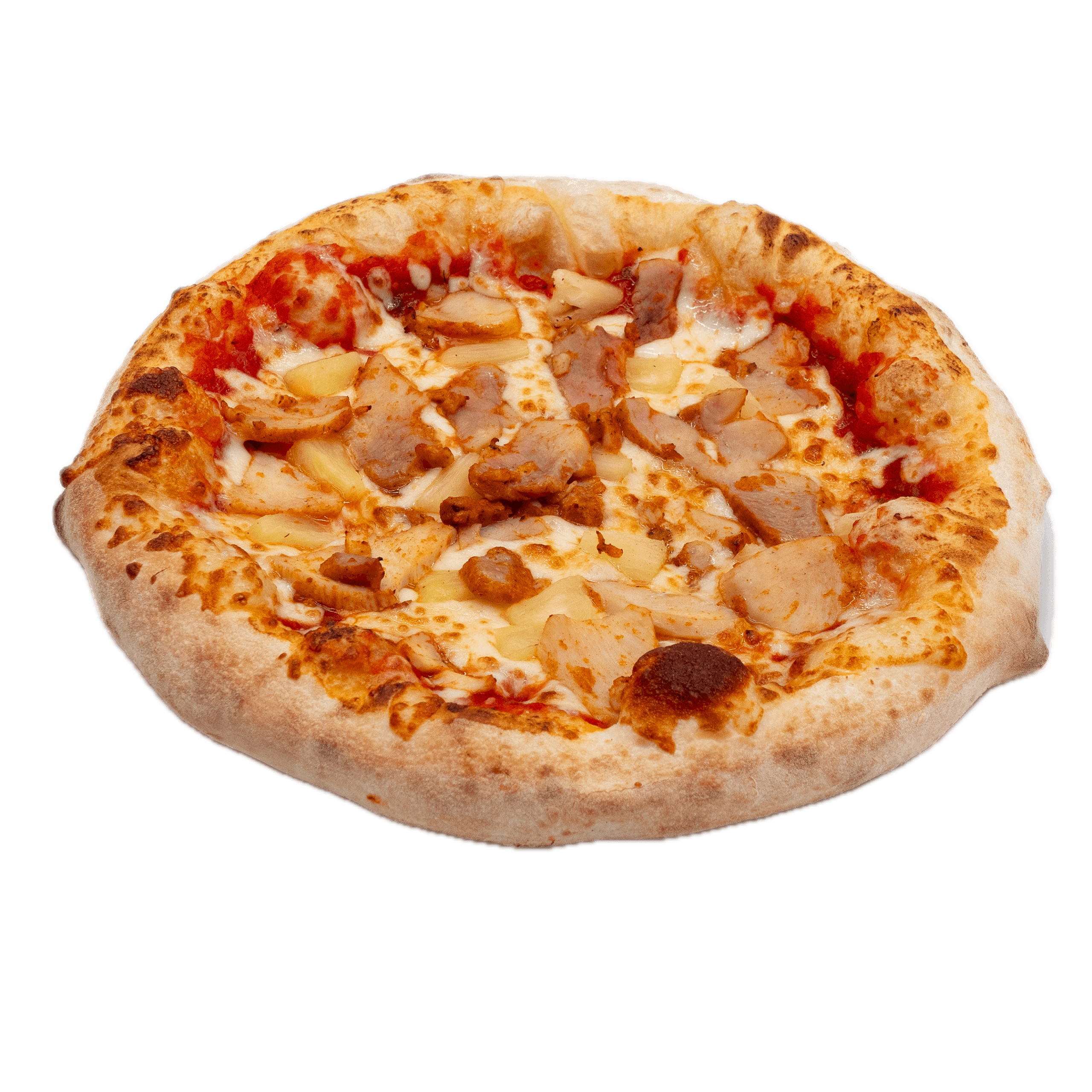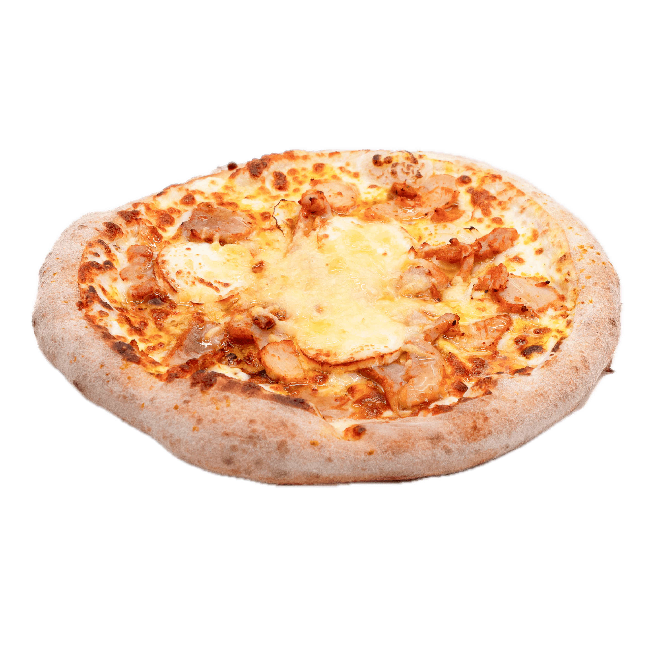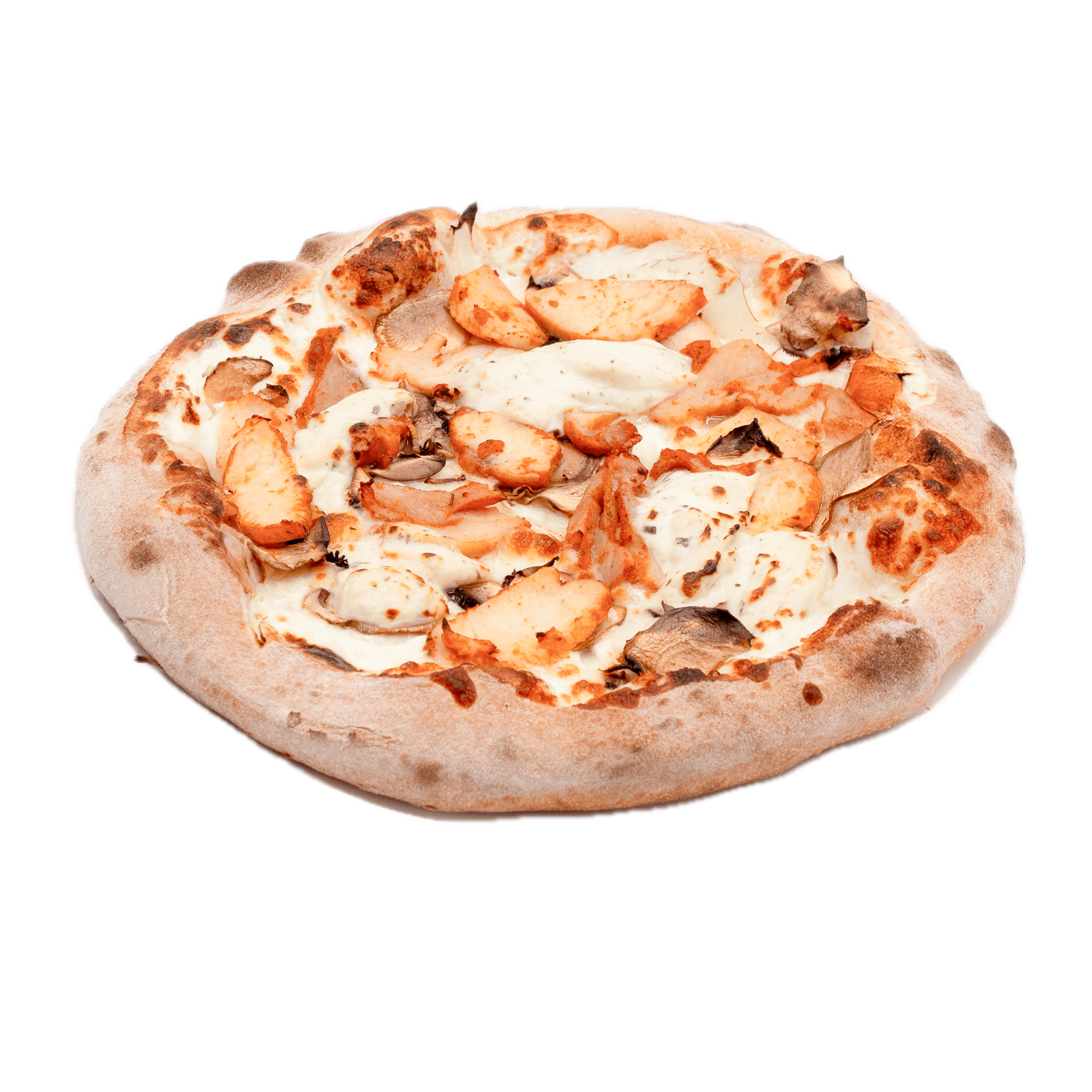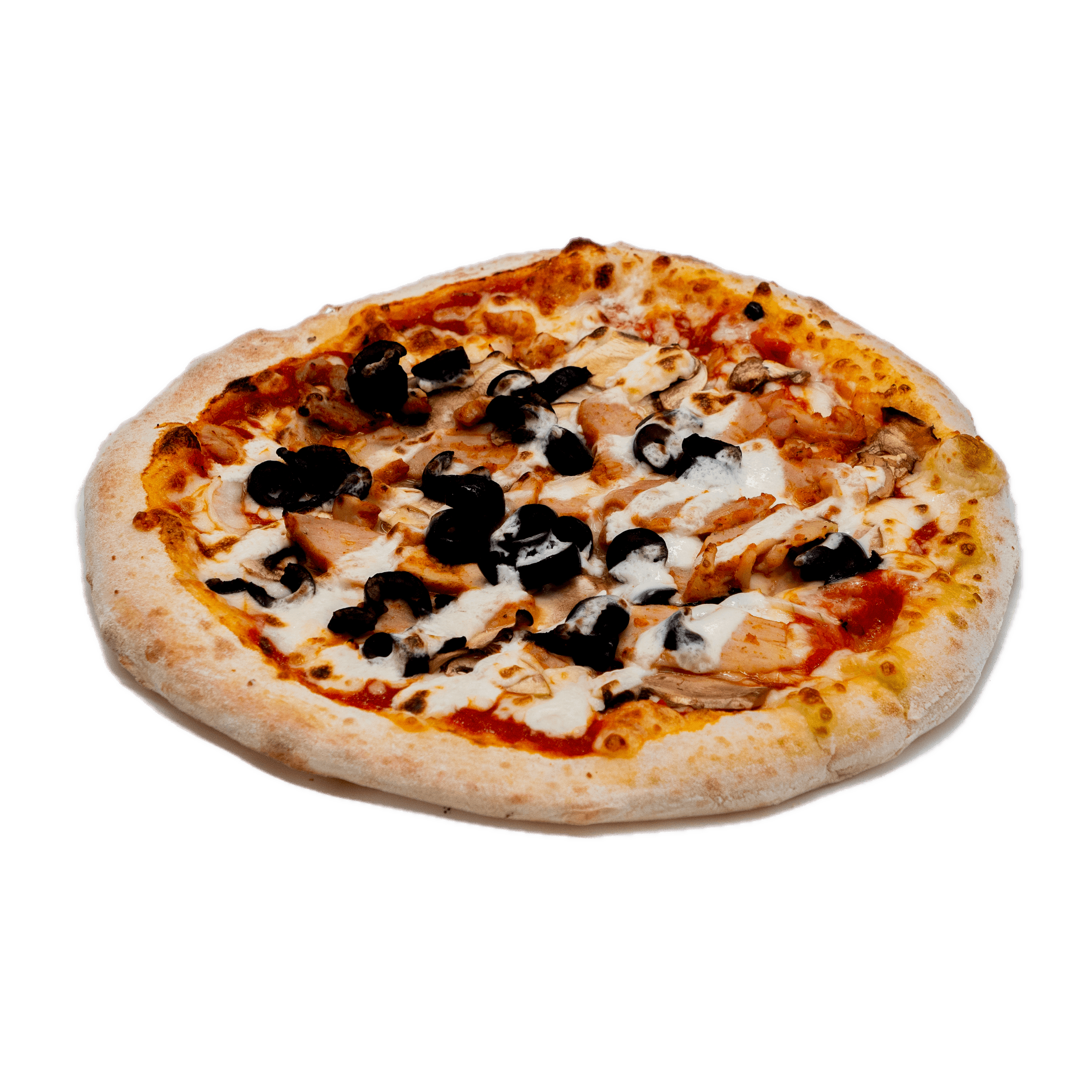 Sauce tomate, mozzarella, champignons frais, poulet tikka, oignons rouges, olives noires, filet de crème