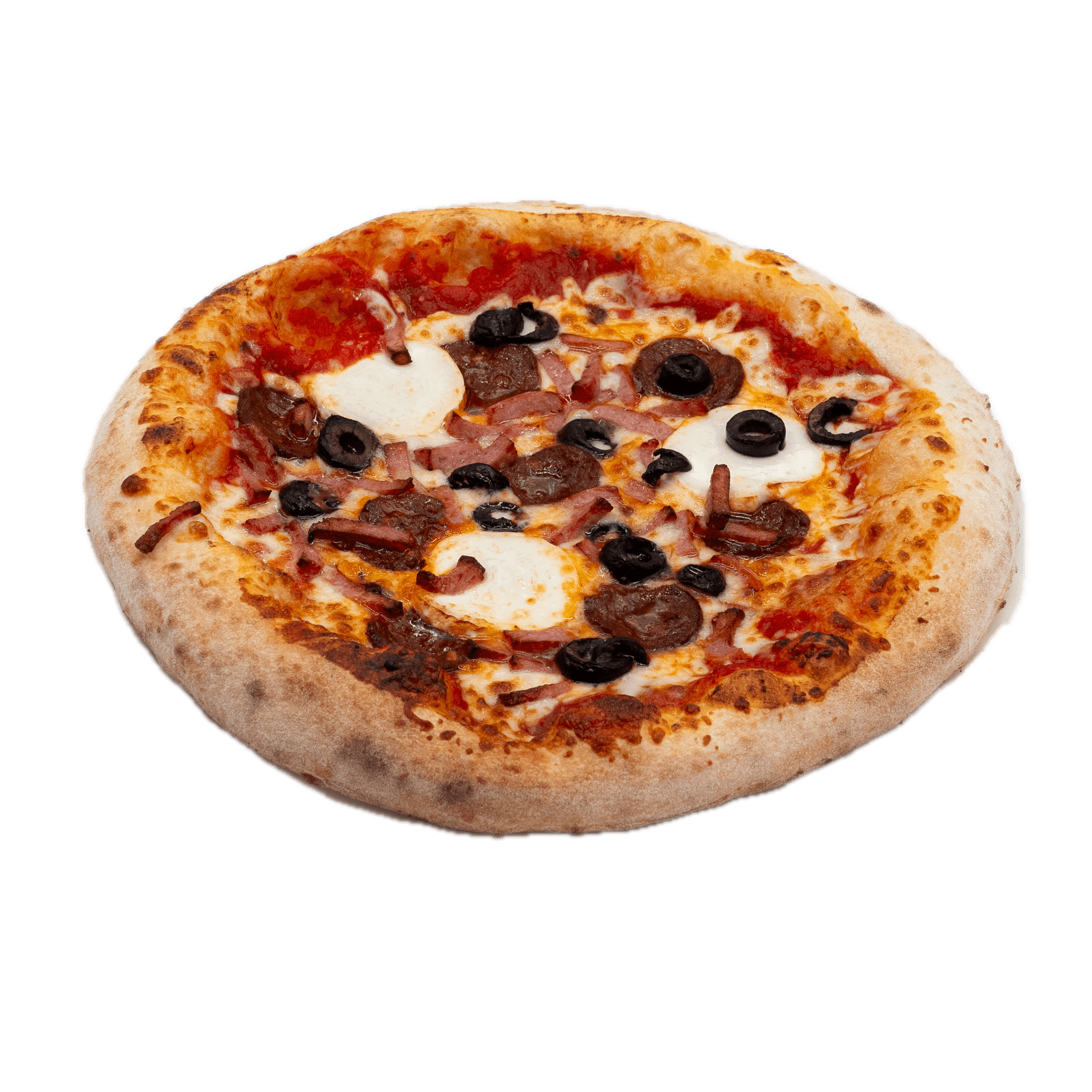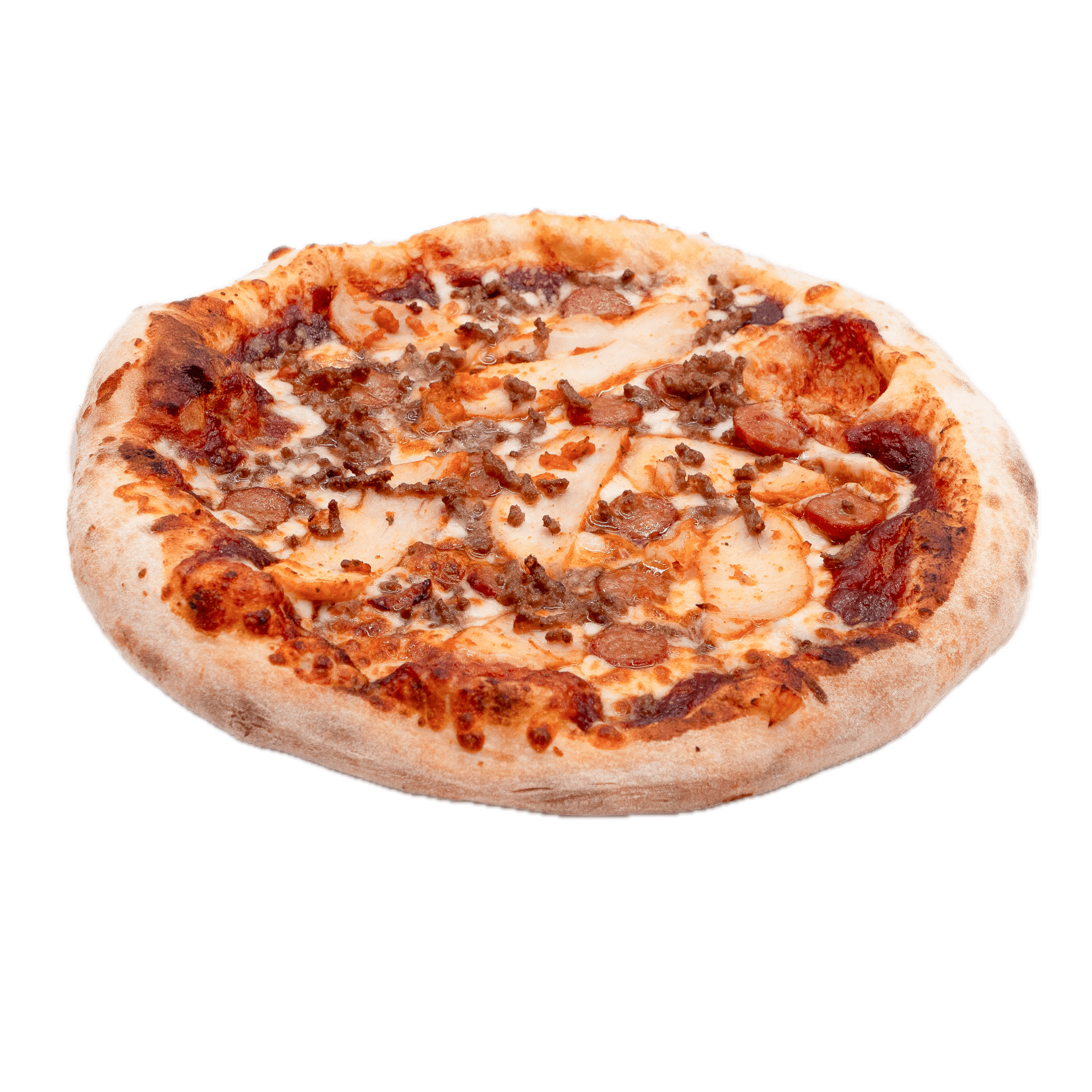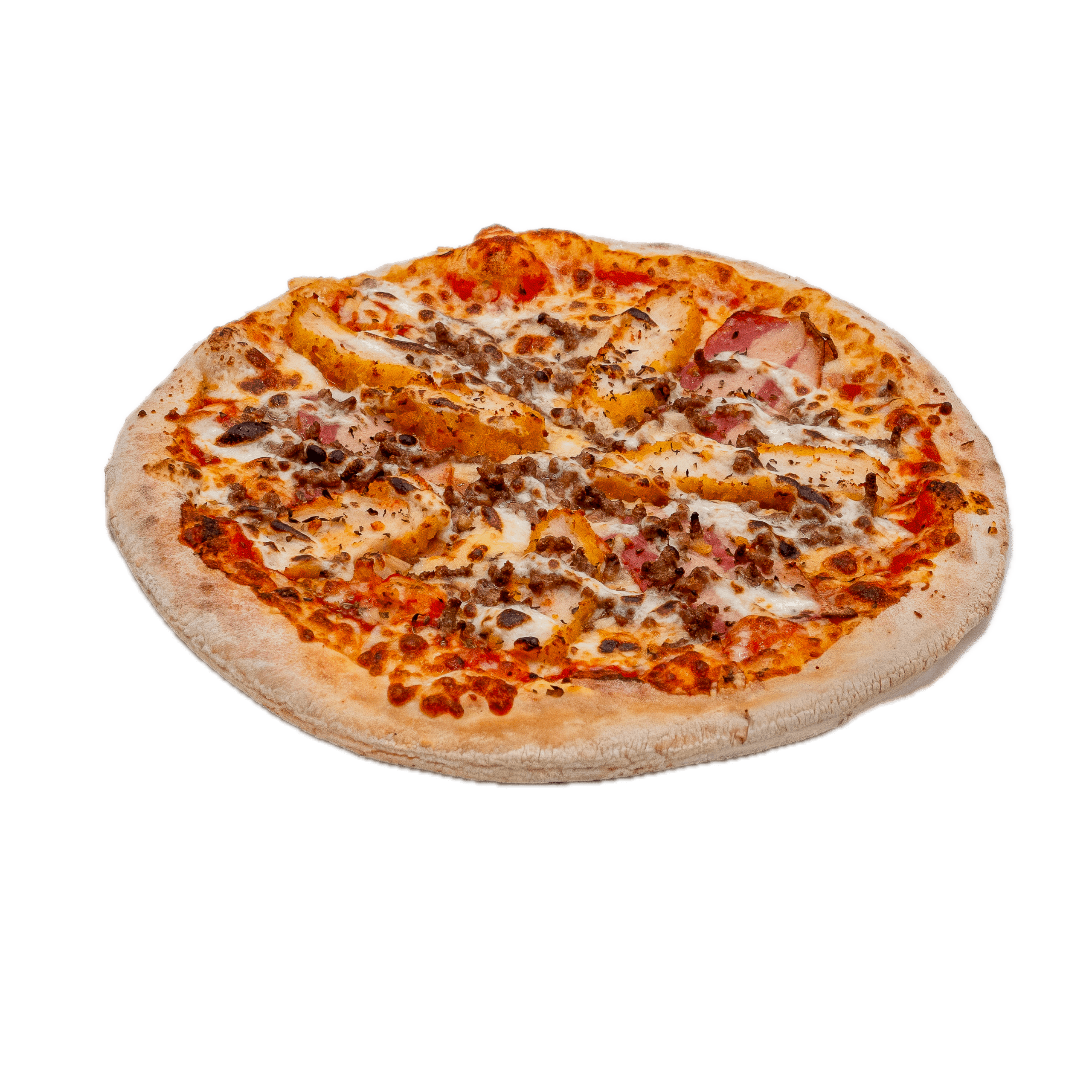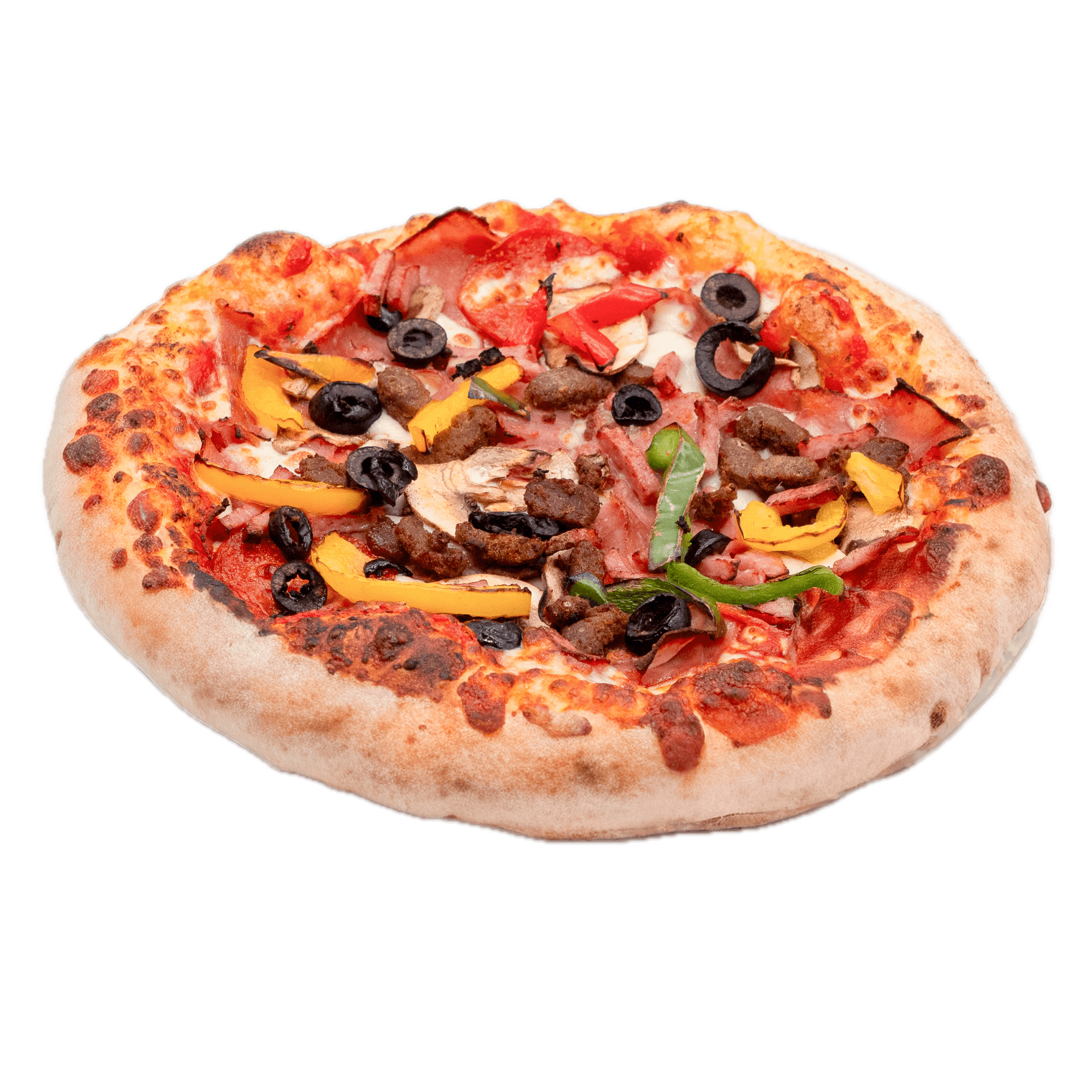 Sauce tomate, jambon, double mozzarella, pepperoni, lardons, poivrons, champignons, boeuf épicé, olives noires