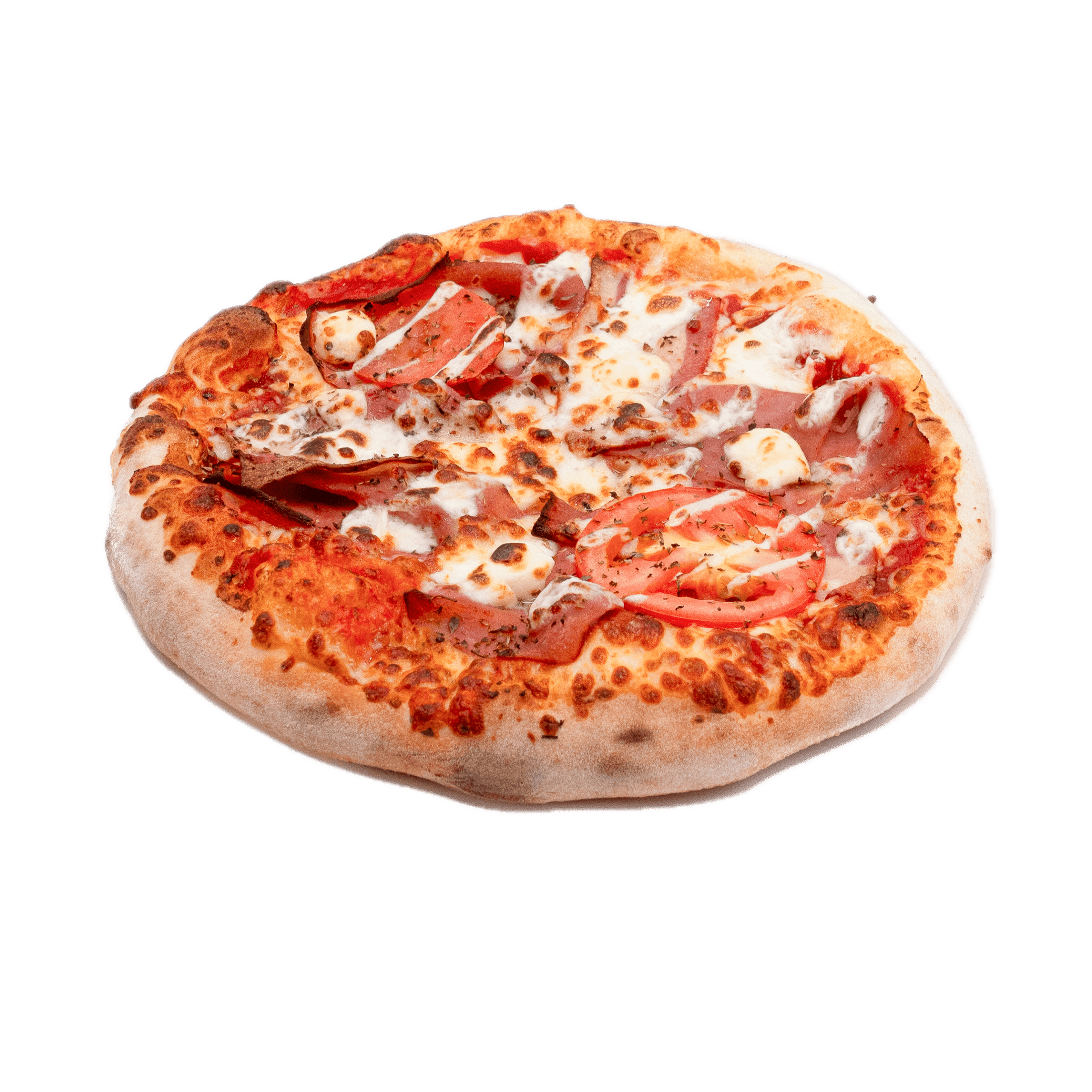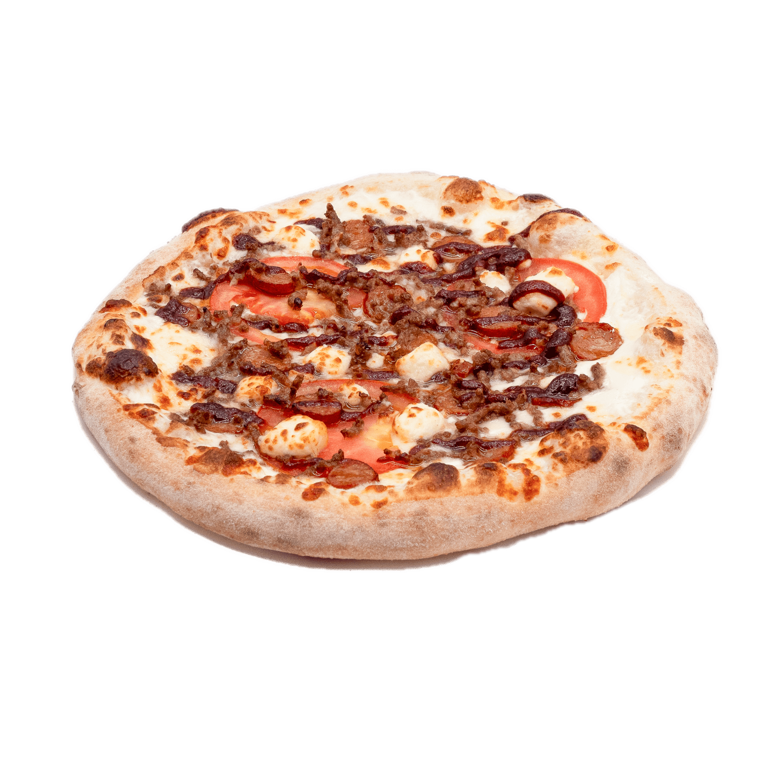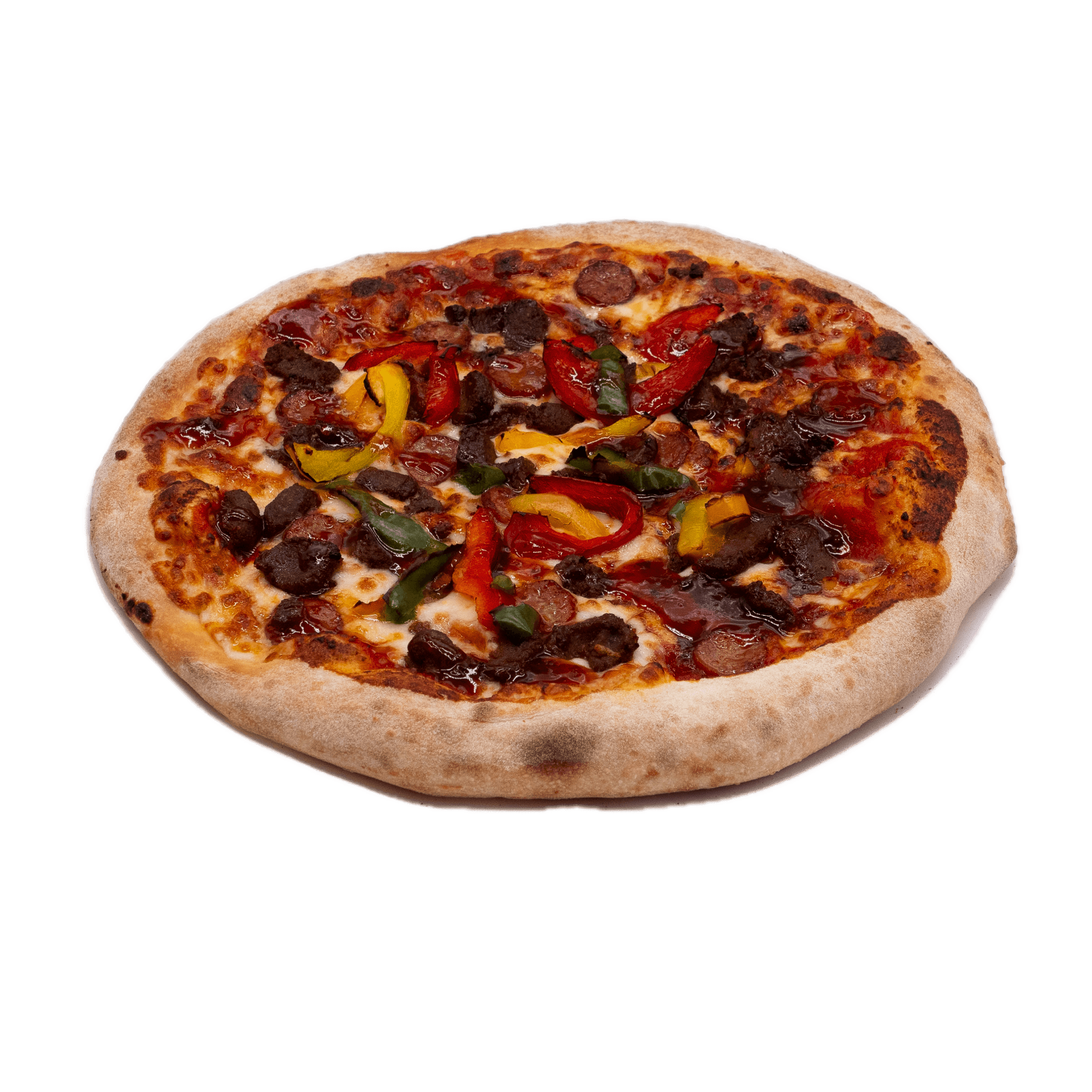 Sauce tomate, jambon, double mozzarella, pepperoni, lardons, poivrons, champignons, boeuf épicé, olives noires
