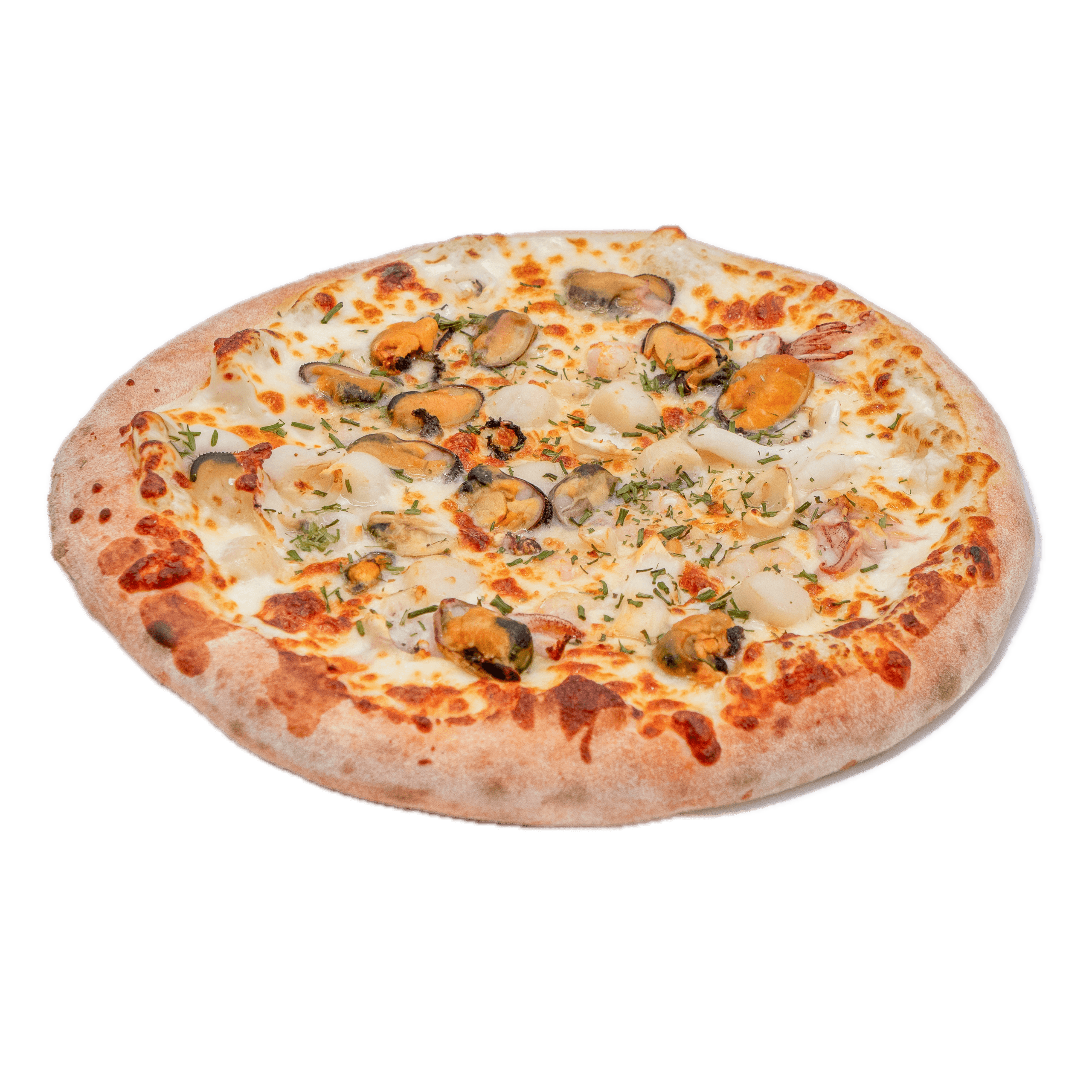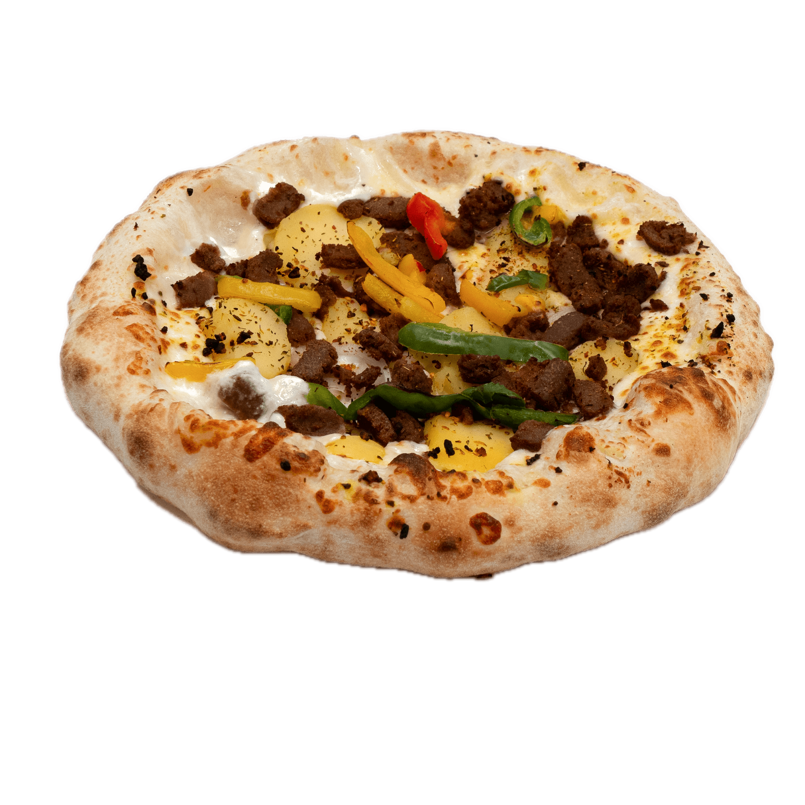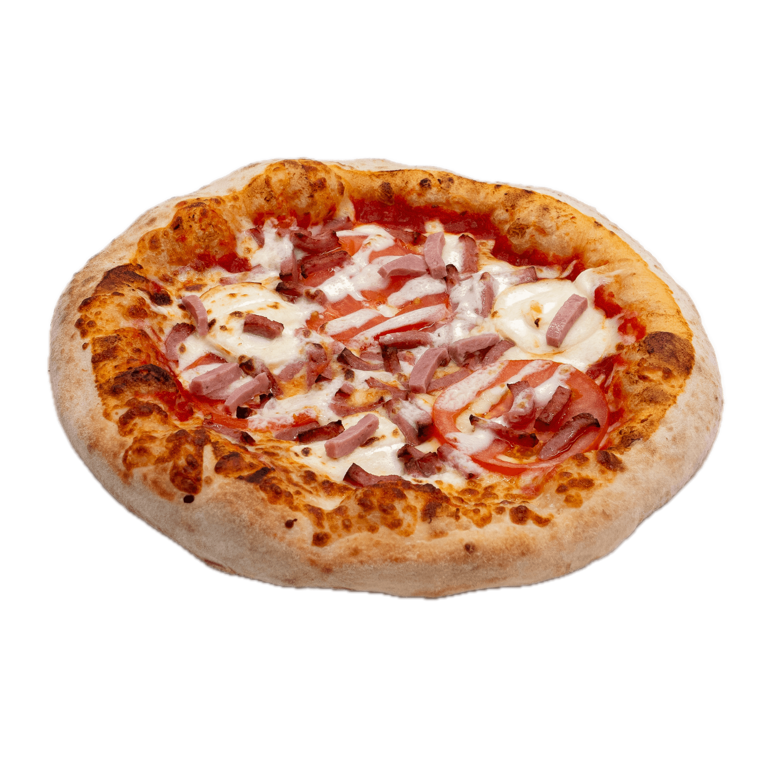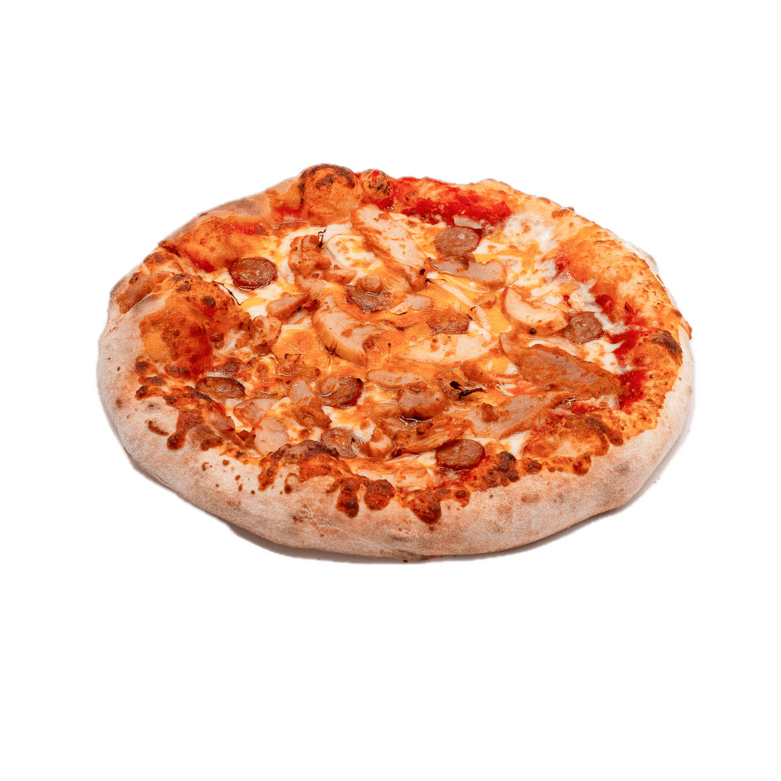 Sauce tomate, jambon, double mozzarella, pepperoni, lardons, poivrons, champignons, boeuf épicé, olives noires