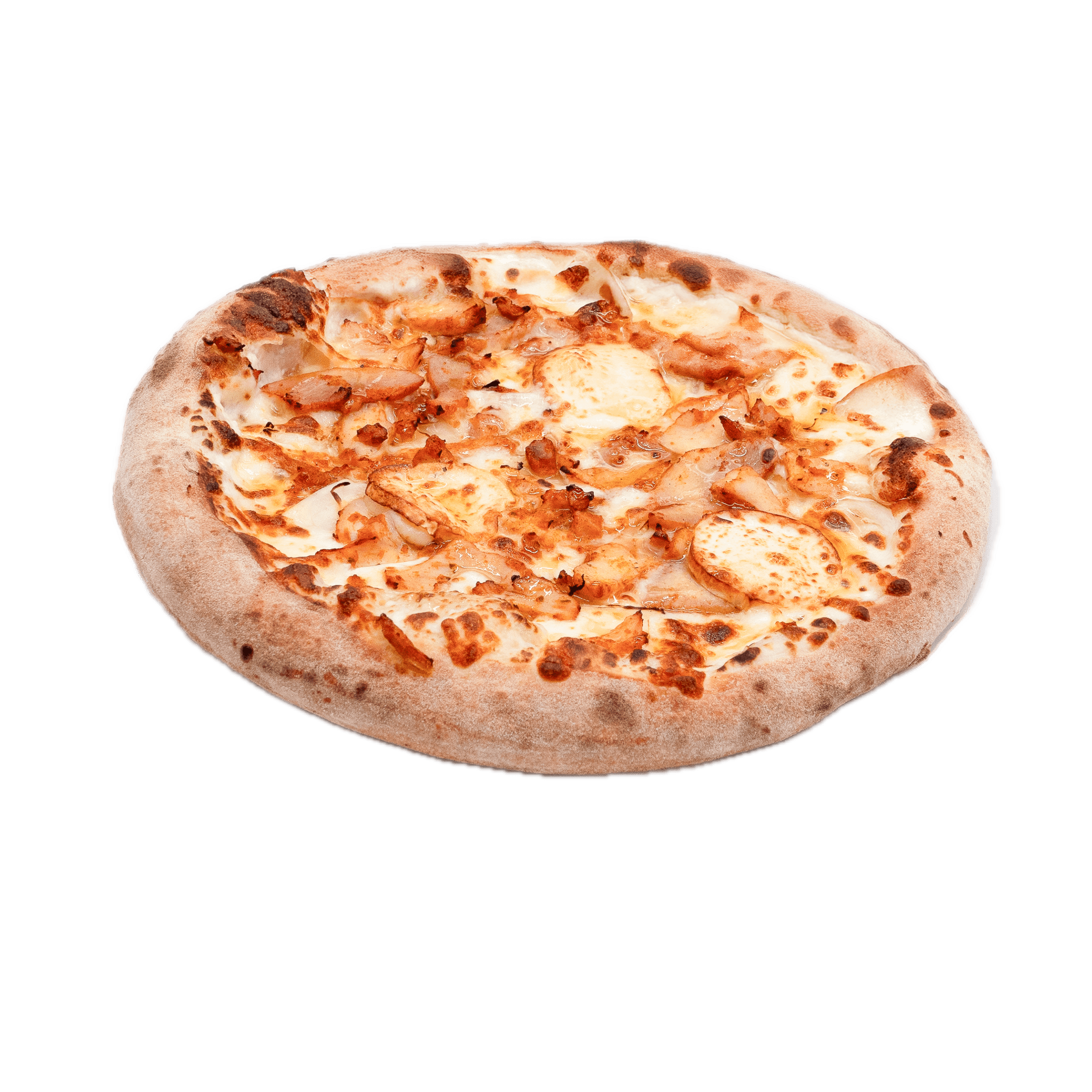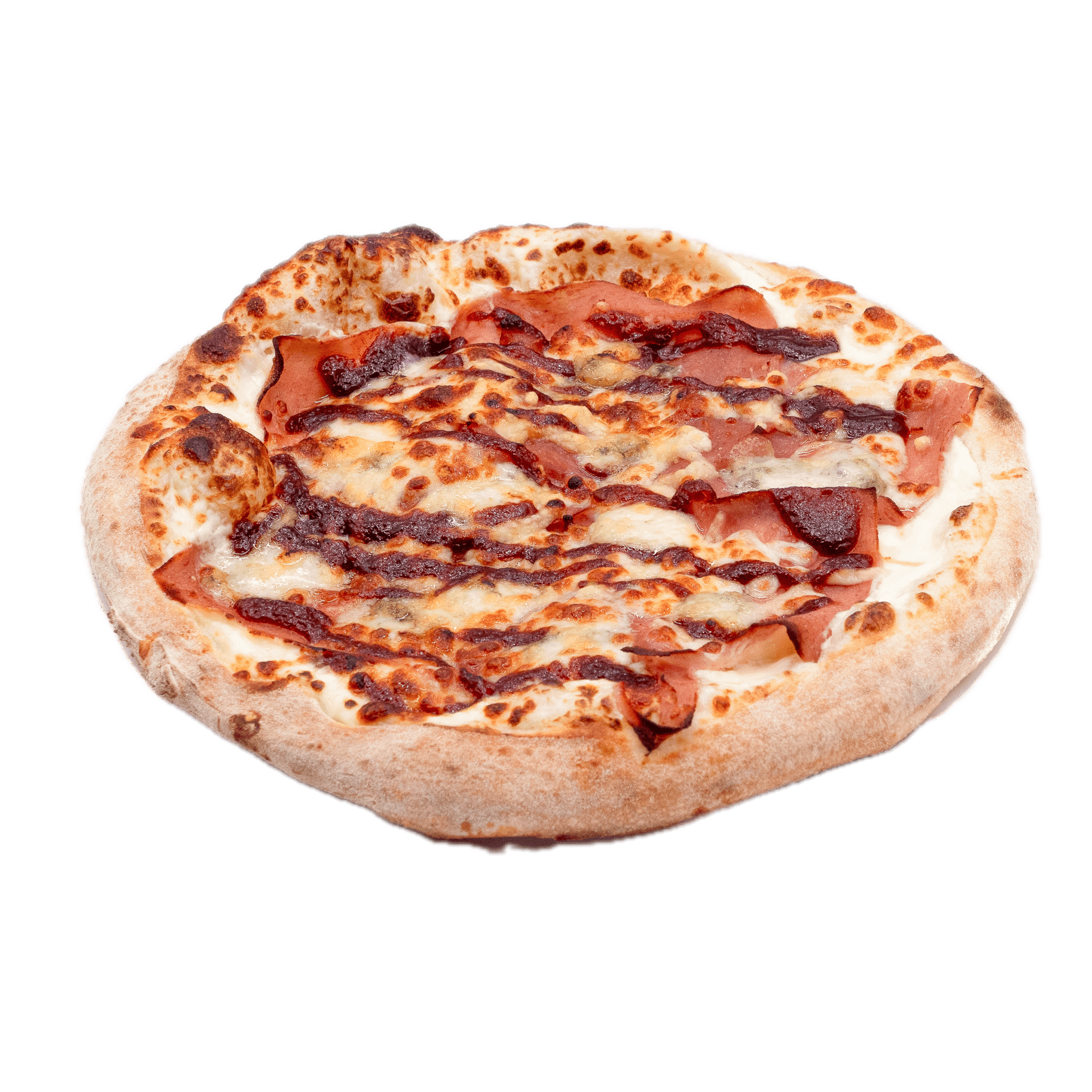 Crème fraîche légère, mozzarella, filet de sauce barbecue, jambon, gorgonzola, parmesan, emmental
