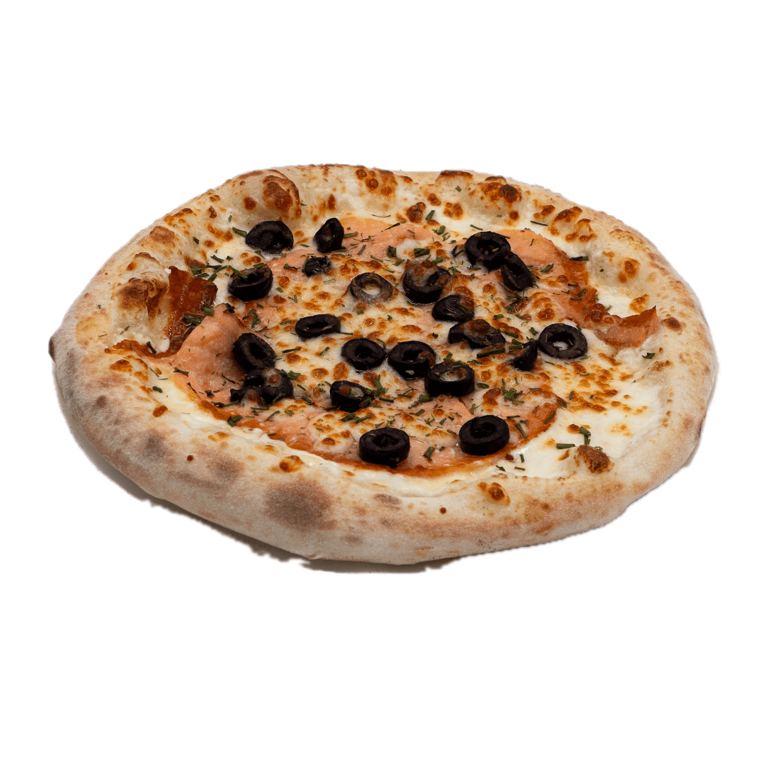 Crème fraîche légère, mozzarella, olives noires, jus de citron, double saumon, ciboulette
