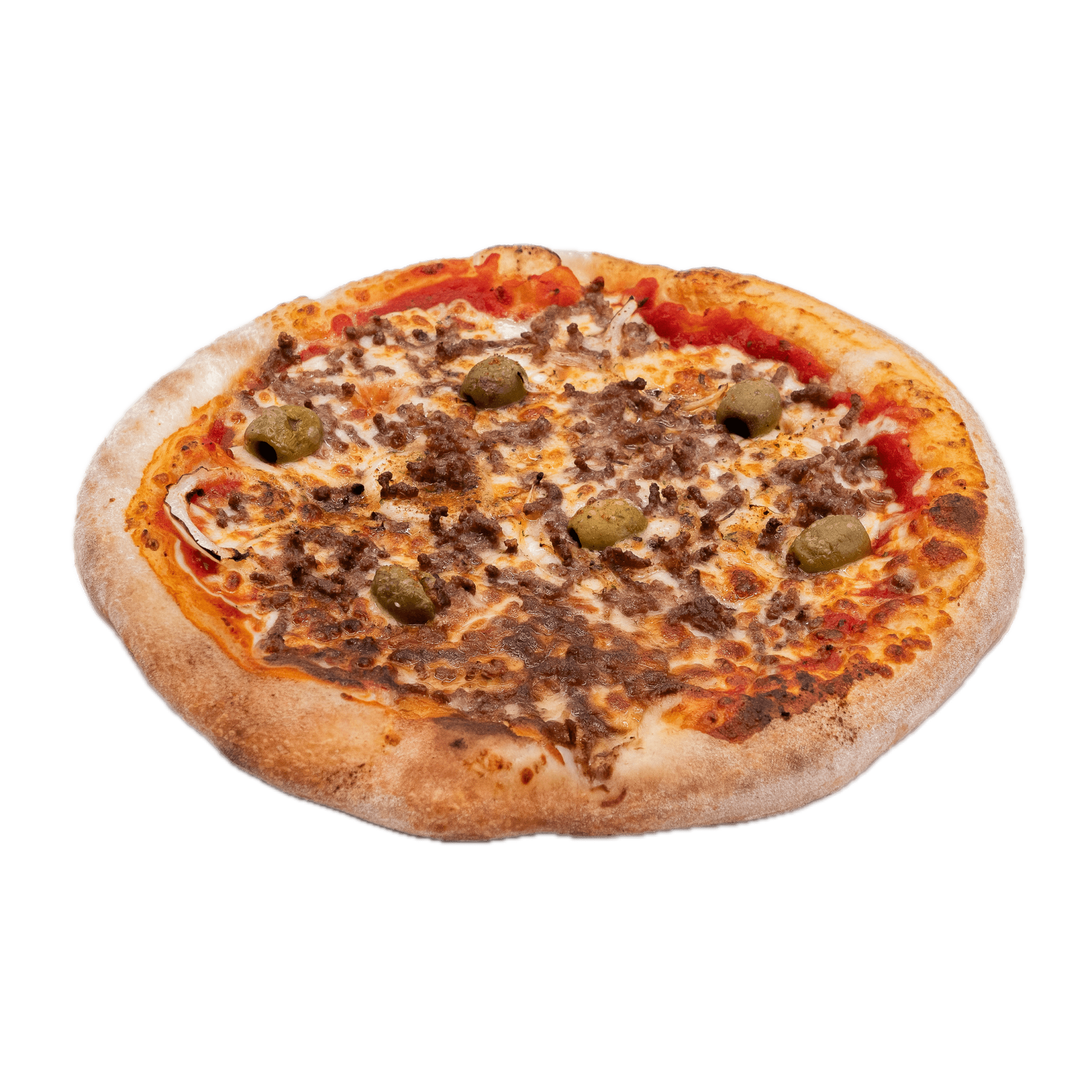 Sauce tomate, mozzarella, double boeuf haché, oignons rouges, olives vertes, filet d’huile d’olive, tomates séchées, épices