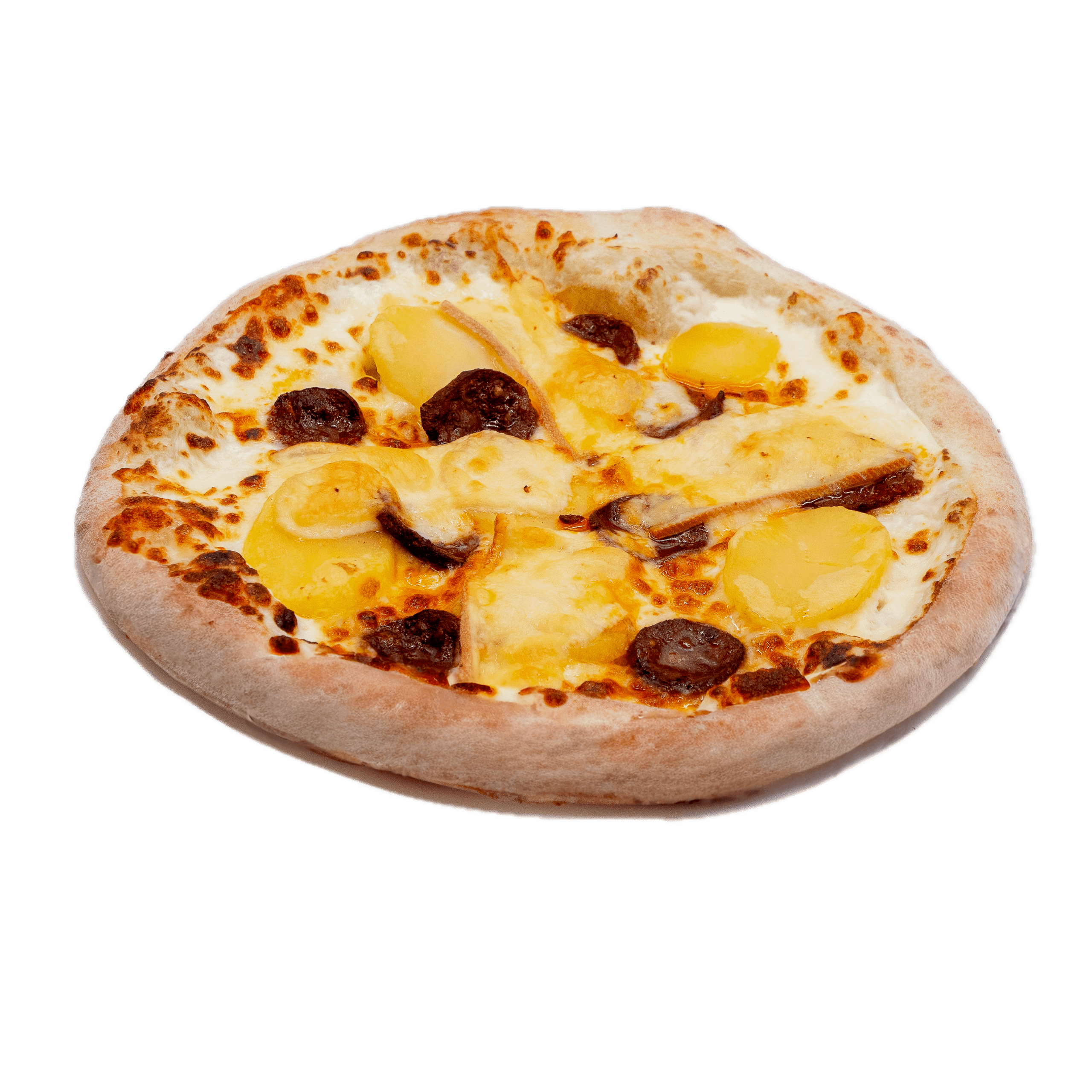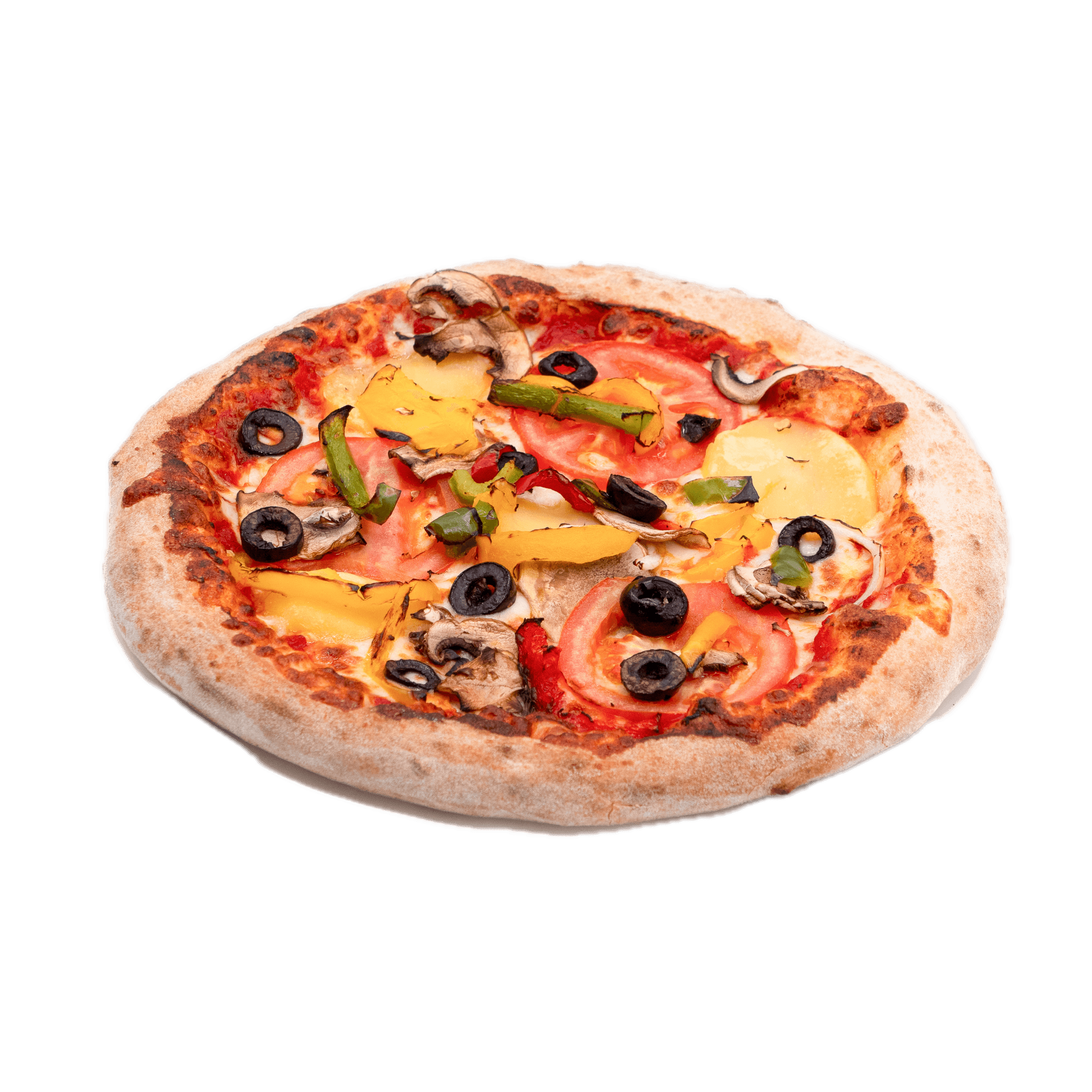 Sauce tomate, mozzarella, oignons rouges, poivrons, pommes de terres, champignons frais, tomates fraîches, olives noires