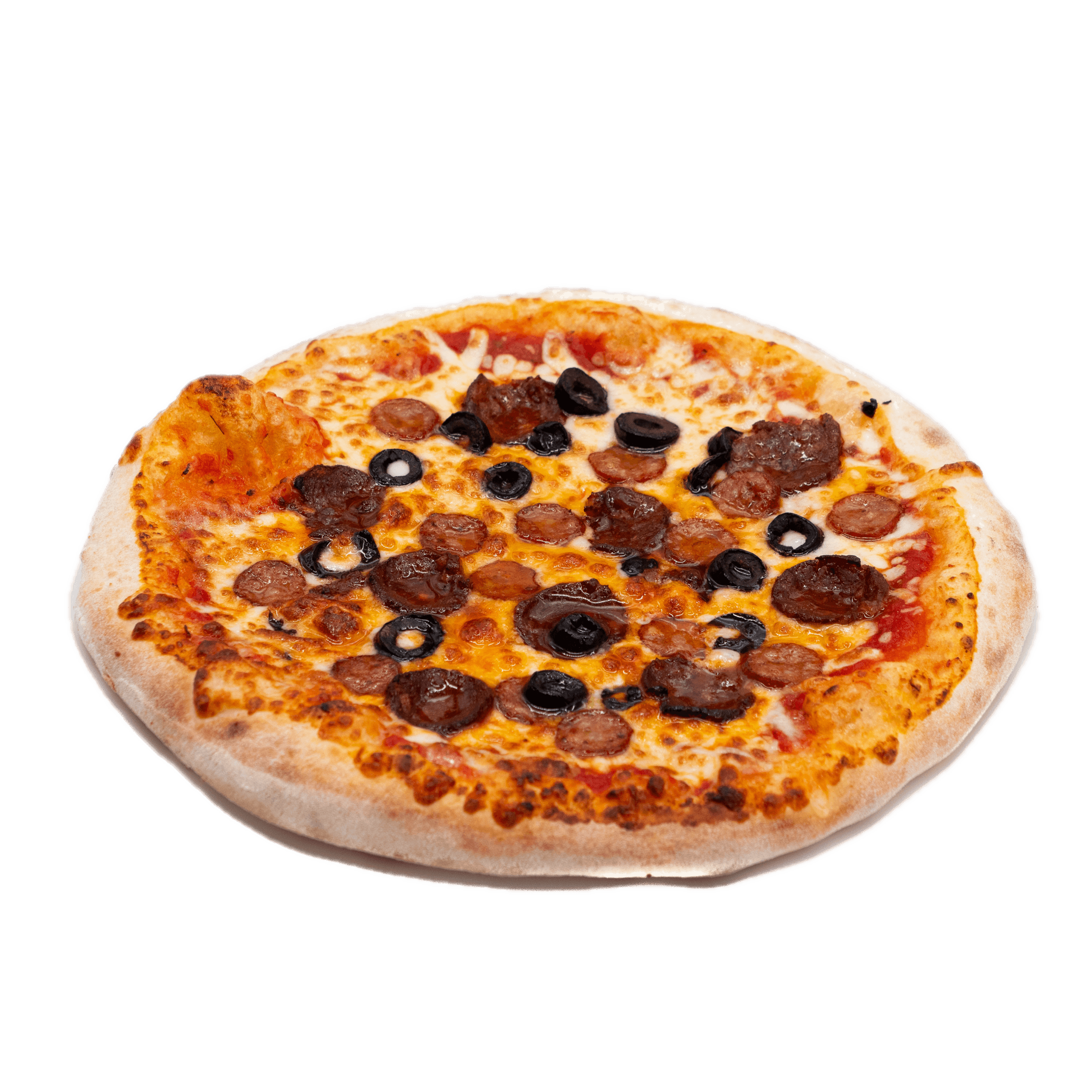 Sauce tomate, mozzarella, double merguez, chorizo, olives noires