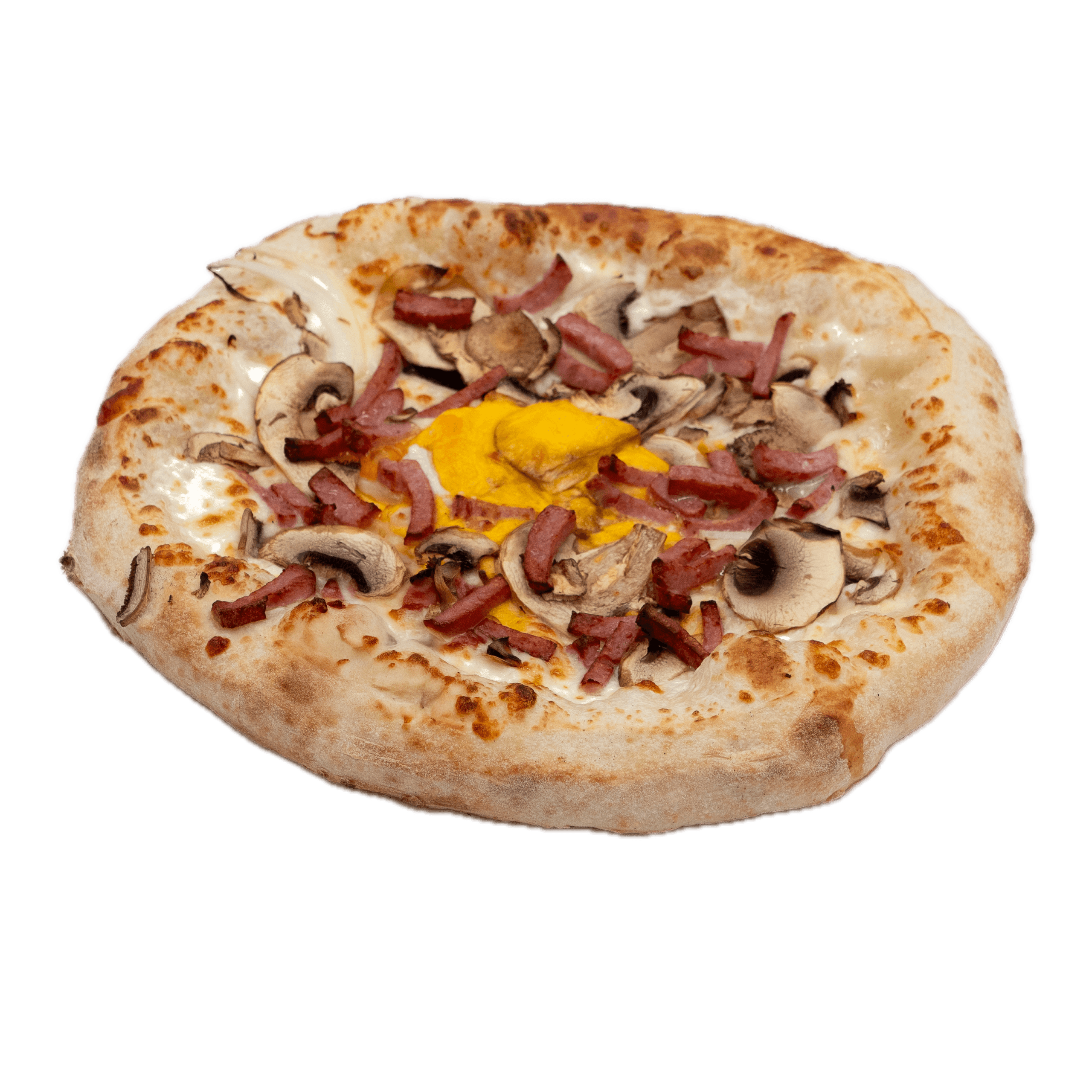 Crème fraiche légère, mozzarella, champignons frais, lardons, oeuf, oignons rouges