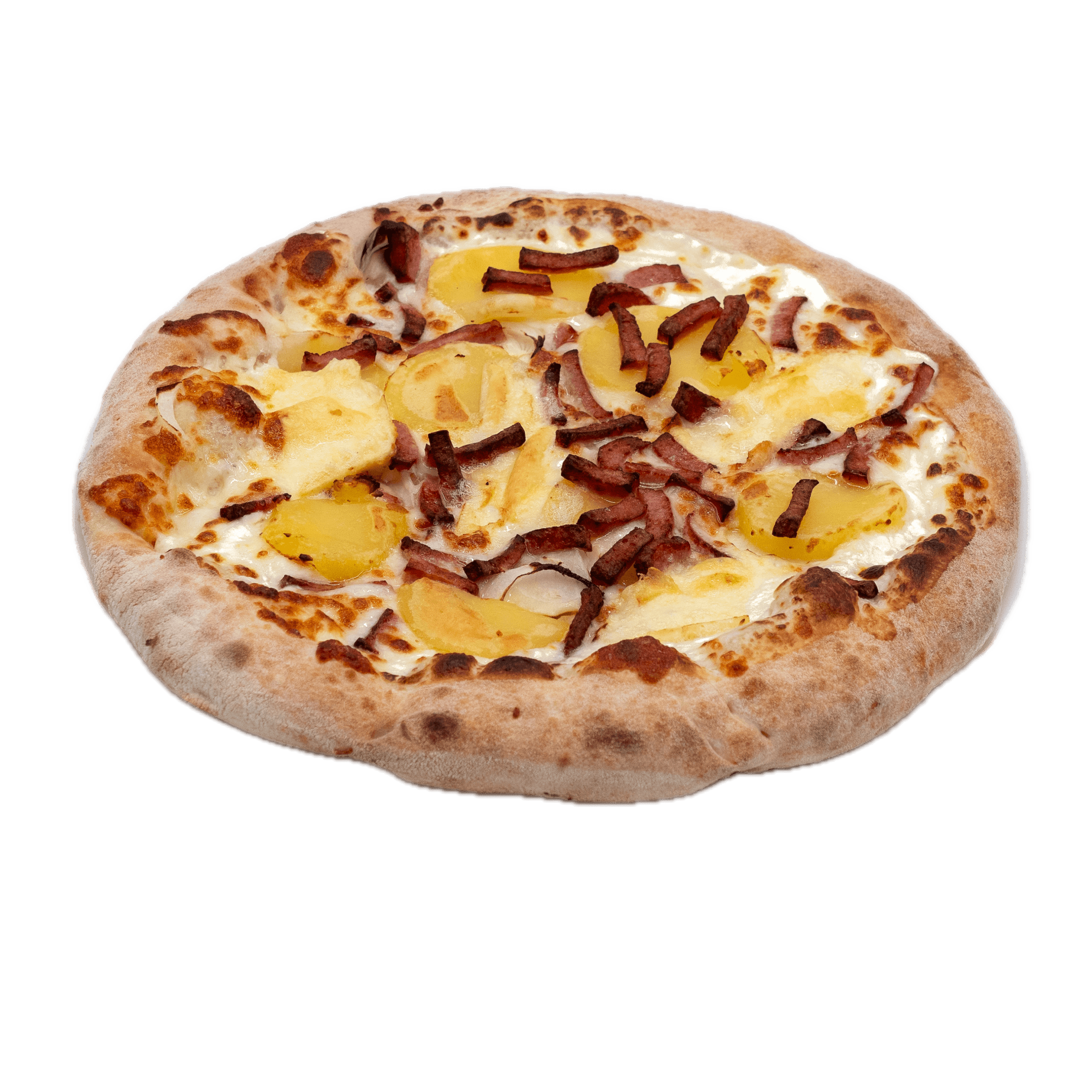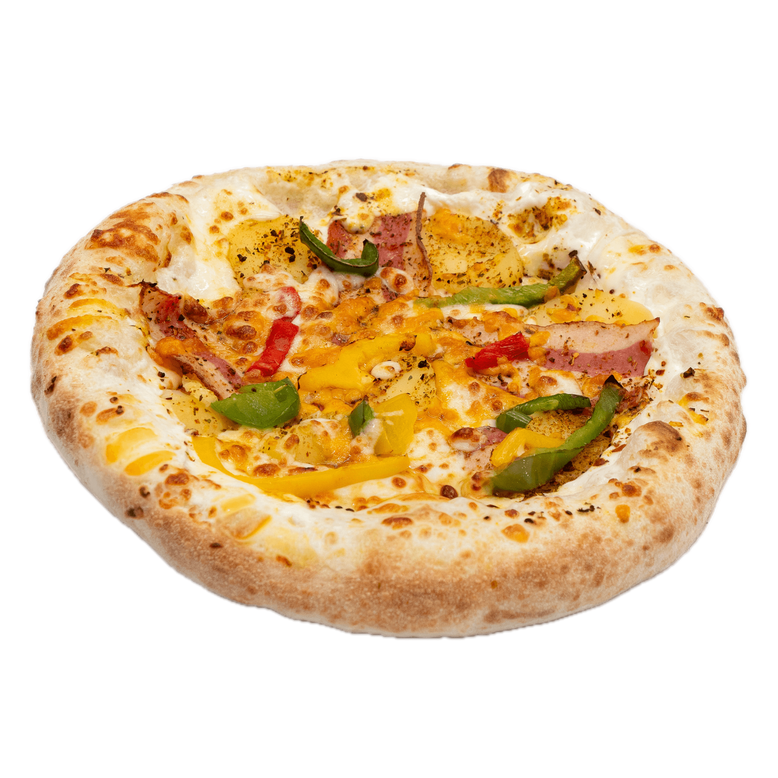 Crème fraiche, mozzarella, bacon, pommes de terre, oignons rouges, épices, poivrons, cheddar