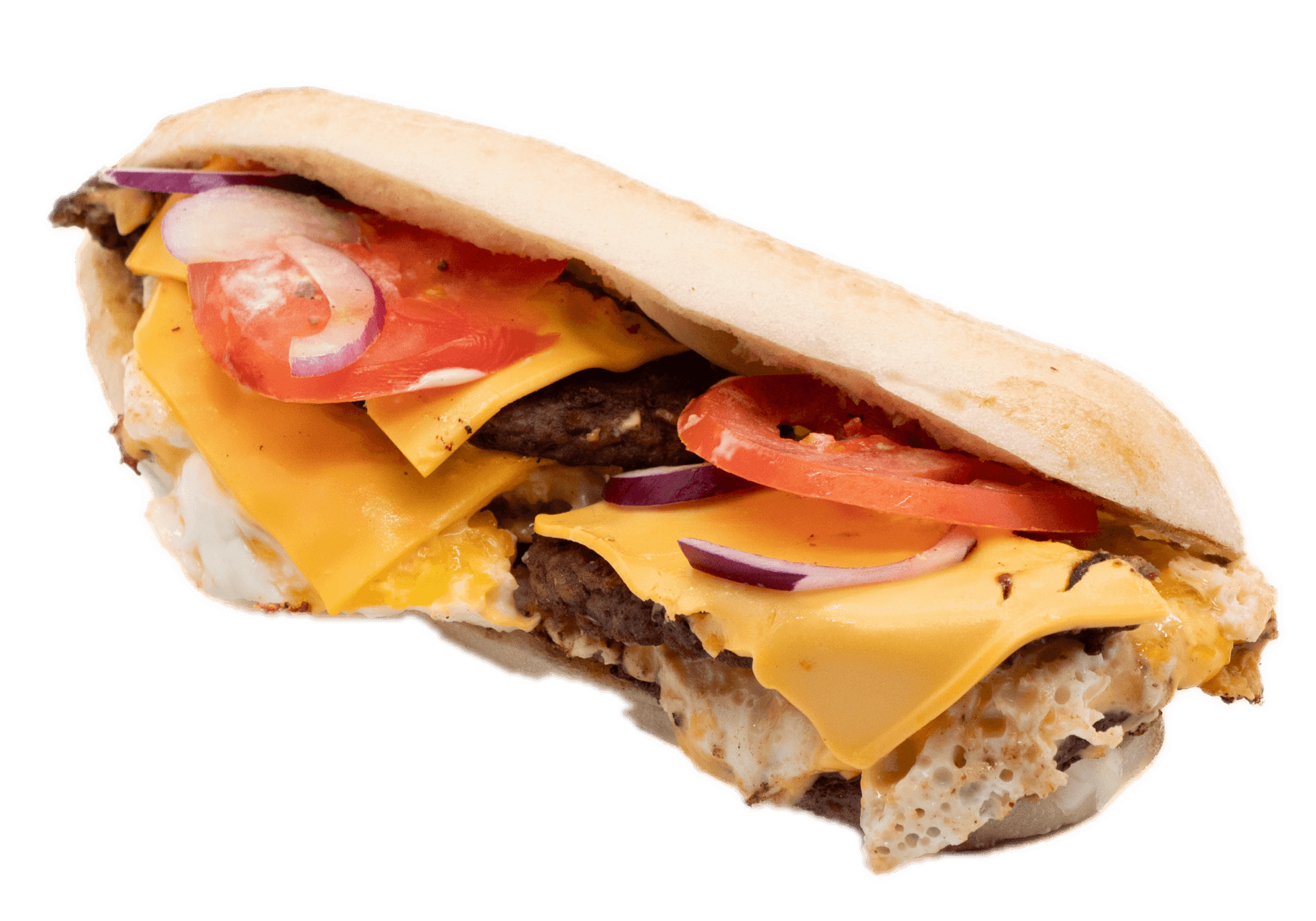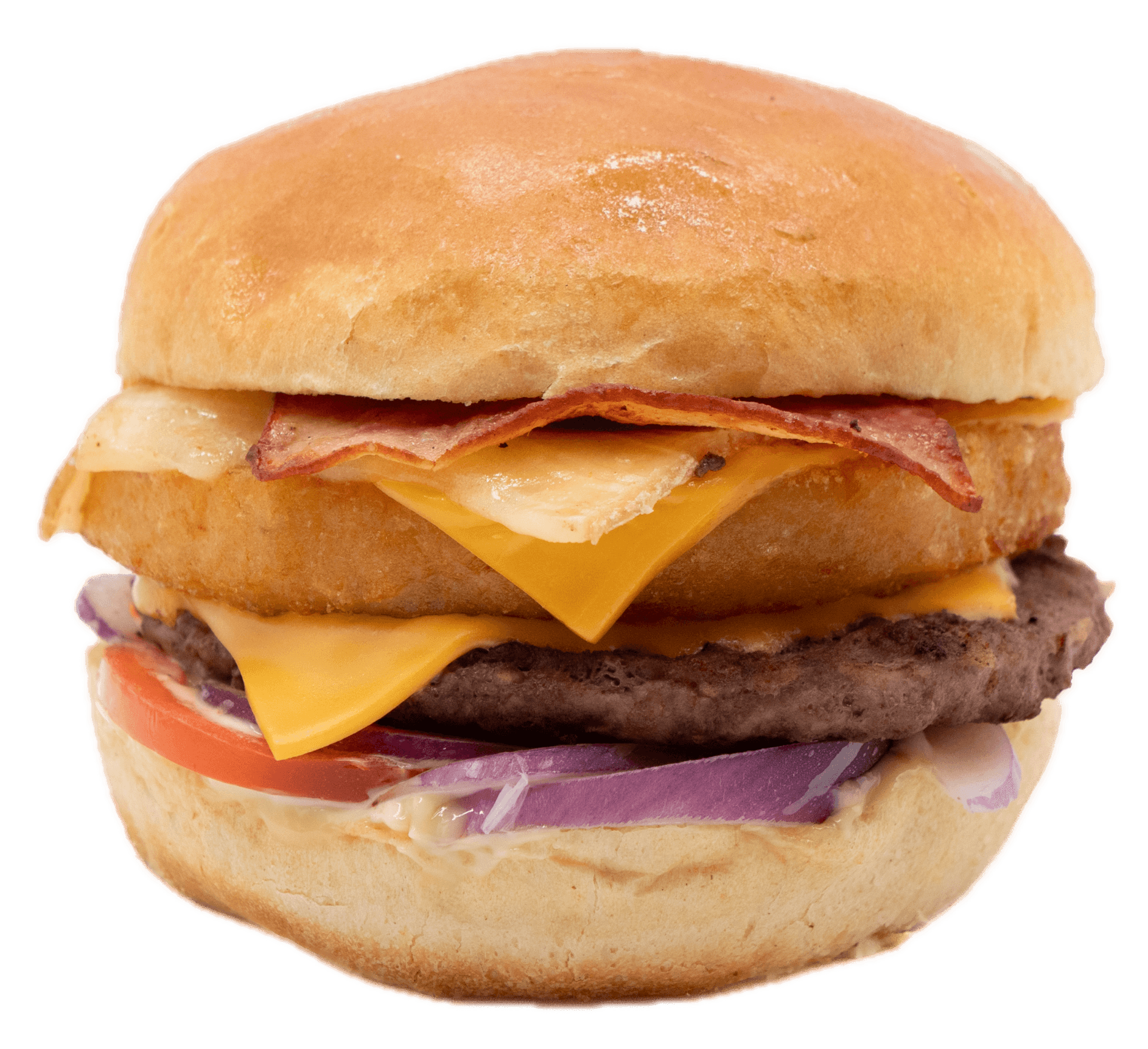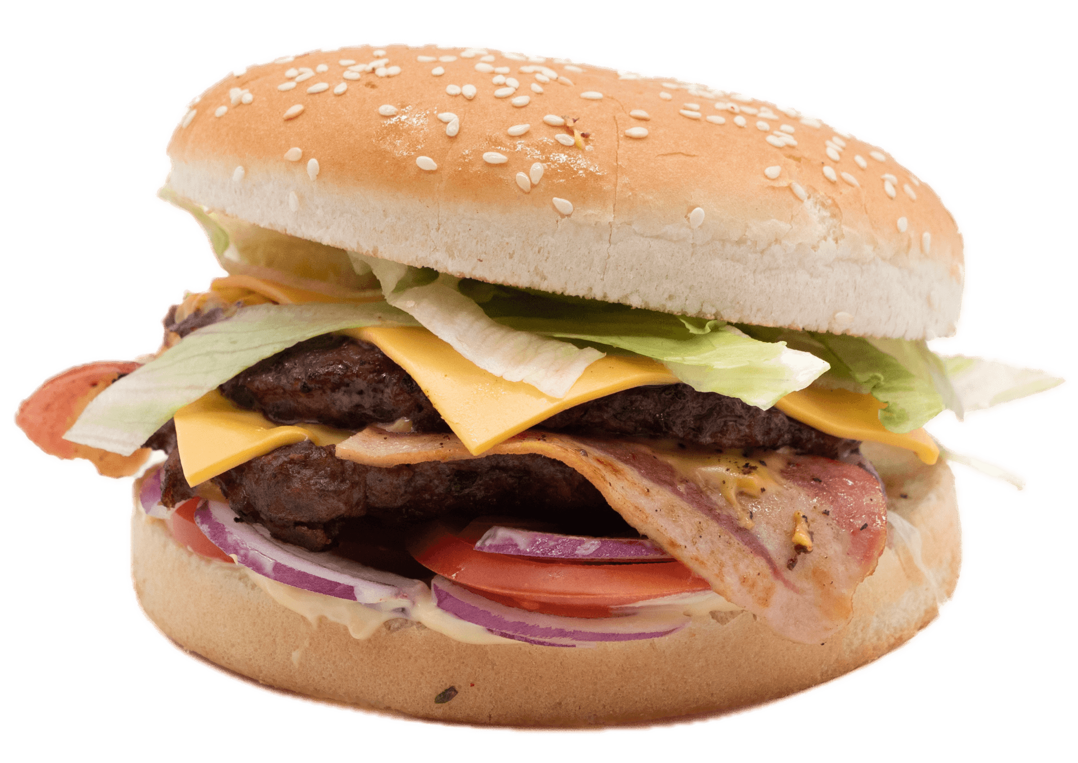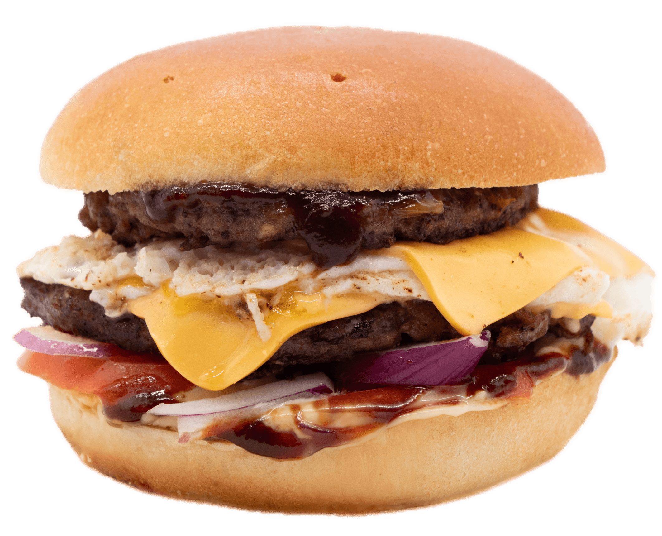 Pain spécial, 2 steaks 45gr, oeuf, emmental, salade, tomates, oignons rouges, sauce barbecue