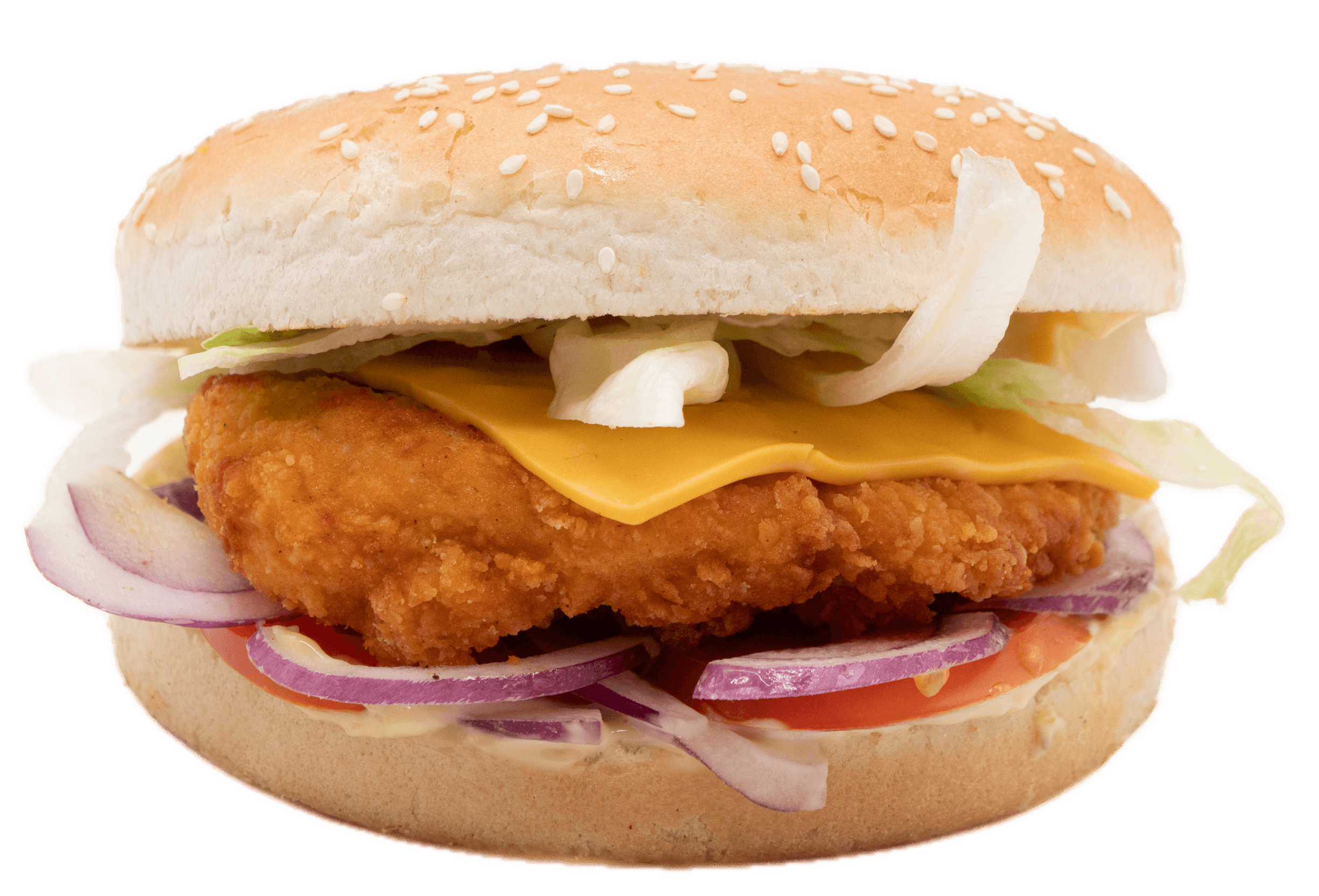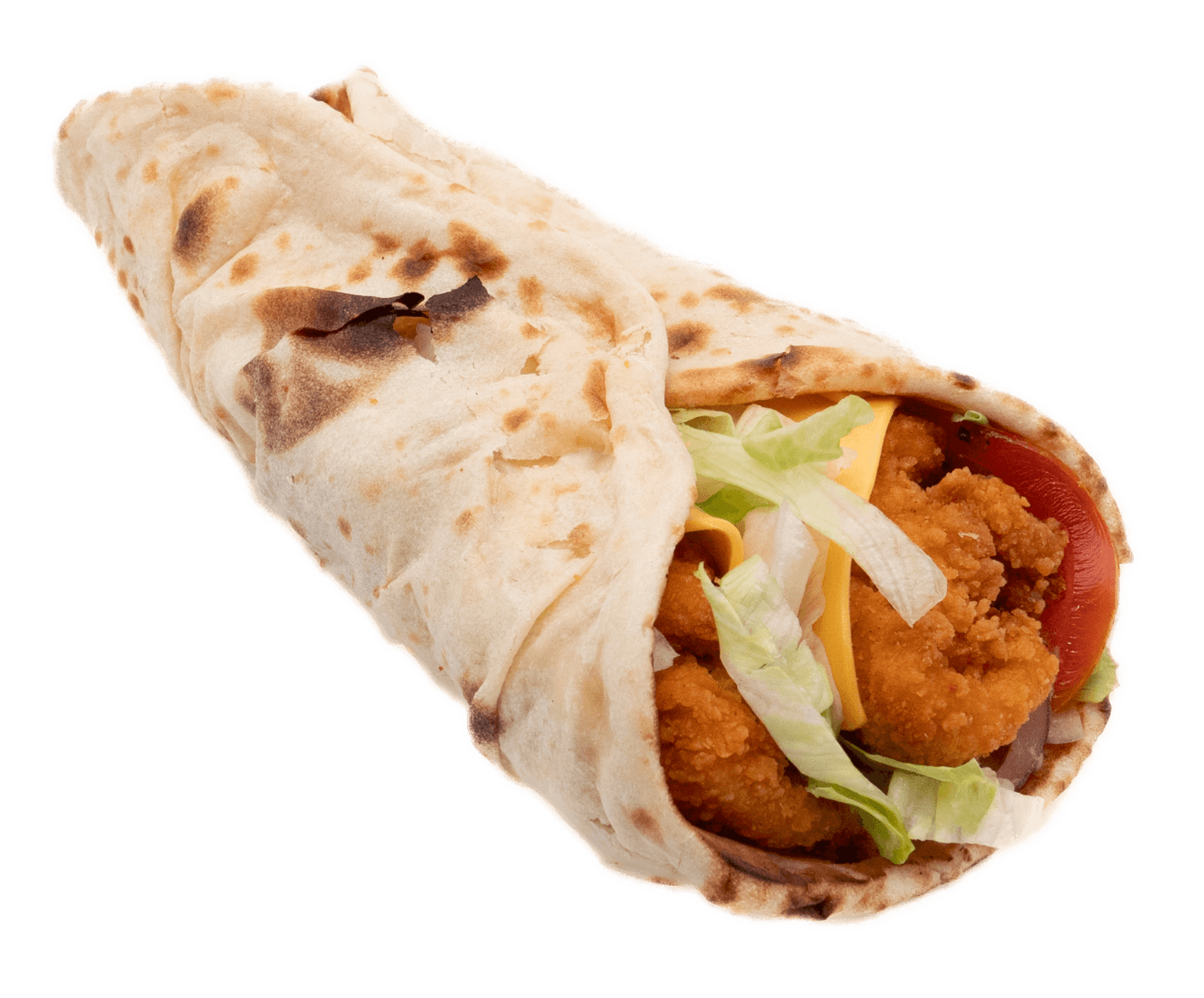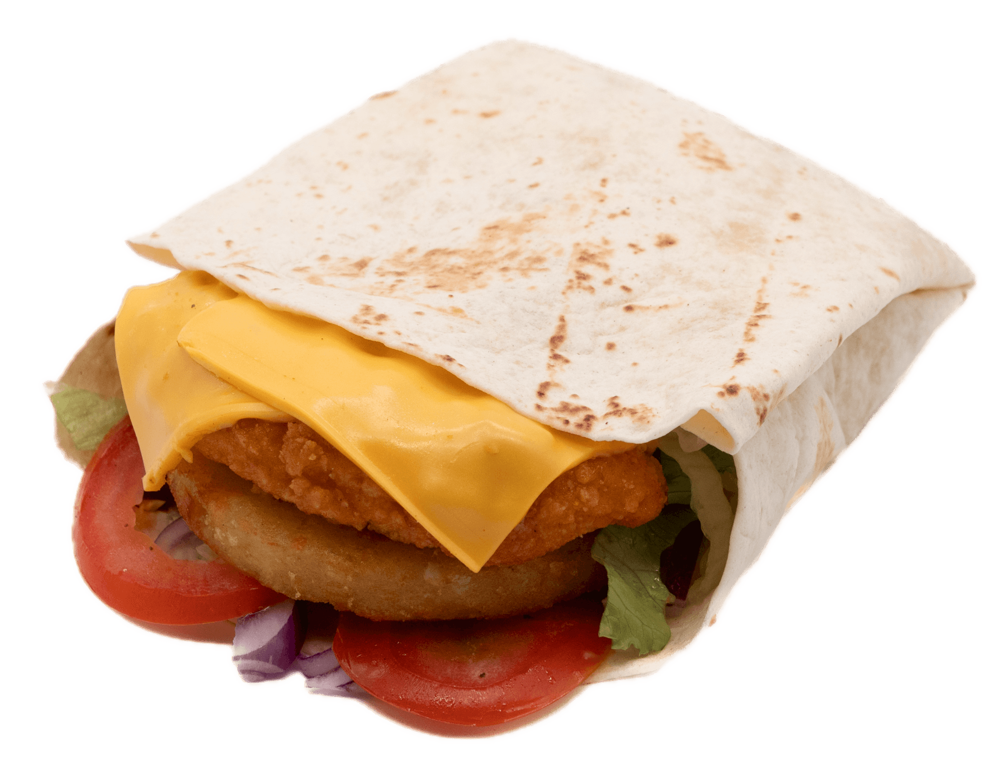 Galettes Tortillas, Filet de poulet pané, galette de pomme de terre, 2 cheddars, Salades, tomates, Oignons, sauce spéciale